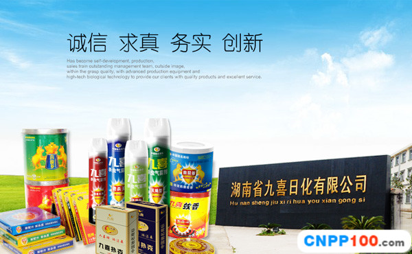 湖南省九喜日化有限公司創(chuàng)建于2001年,家用衛(wèi)生殺蟲(chóng)劑的專業(yè)制造企業(yè)?,F(xiàn)擁有200余畝的大型生產(chǎn)、倉(cāng)儲(chǔ)基地,配備了數(shù)十余條國(guó)內(nèi)先進(jìn)的家庭衛(wèi)生殺蟲(chóng)系列用品自動(dòng)化生產(chǎn)線,企業(yè)生產(chǎn)員工近千人,公司擁有注冊(cè)資本1100萬(wàn)元,固定資產(chǎn)5000萬(wàn)元,近20000平方米的高標(biāo)準(zhǔn)、完全符合環(huán)保要求的現(xiàn)代化標(biāo)準(zhǔn)生產(chǎn)廠房,年生產(chǎn)能力達(dá)240萬(wàn)件蚊香系列產(chǎn)品和1500萬(wàn)罐氣霧殺蟲(chóng)劑。