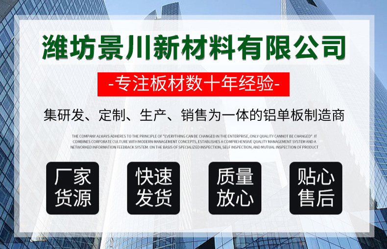 濰坊景川新材料有限公司是一家集各種鋁單板、異型鋁單板、鋁天花板、氟碳噴涂設計、生產(chǎn)、銷售、售后服務于一體的現(xiàn)代化大型企業(yè)。公司交通物流方便快捷,地理位置優(yōu)越,擁有現(xiàn)代化成套的數(shù)控鈑金加工設備和全自動靜電氟碳噴涂設備。產(chǎn)品適用于外墻內(nèi)裝等各種場所,應用范圍廣,能滿足產(chǎn)品不同規(guī)格尺寸的要求,供貨期快。